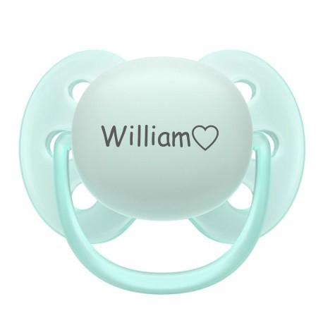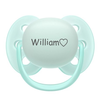 Vi graverer barnets navn eller en tekst gratis på sutten. Alle linjer centreres så det står flot