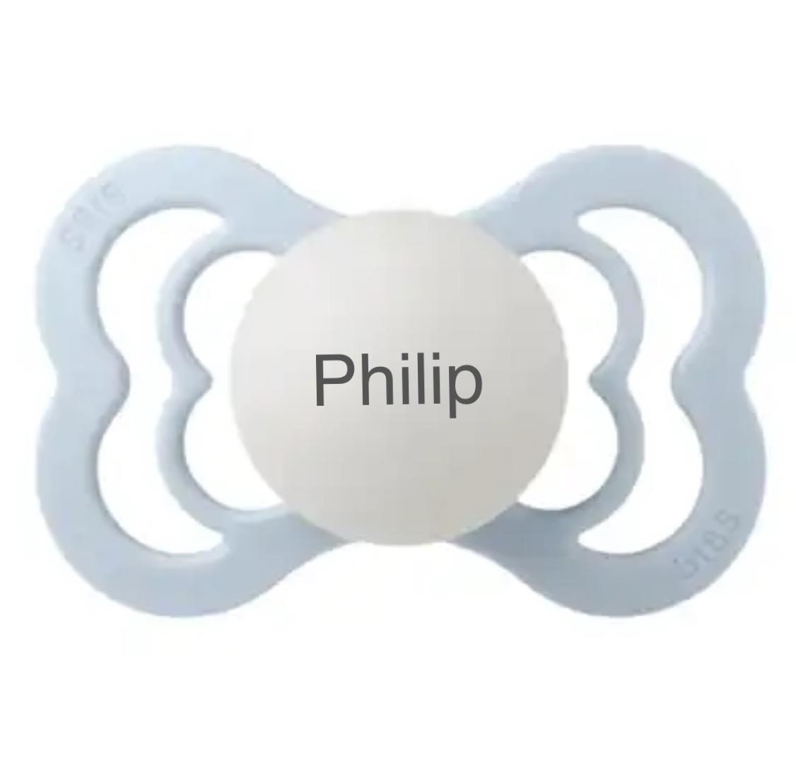 BIBS glow in the dark str 2 SILIKONE Babyblue supreme sut med navn