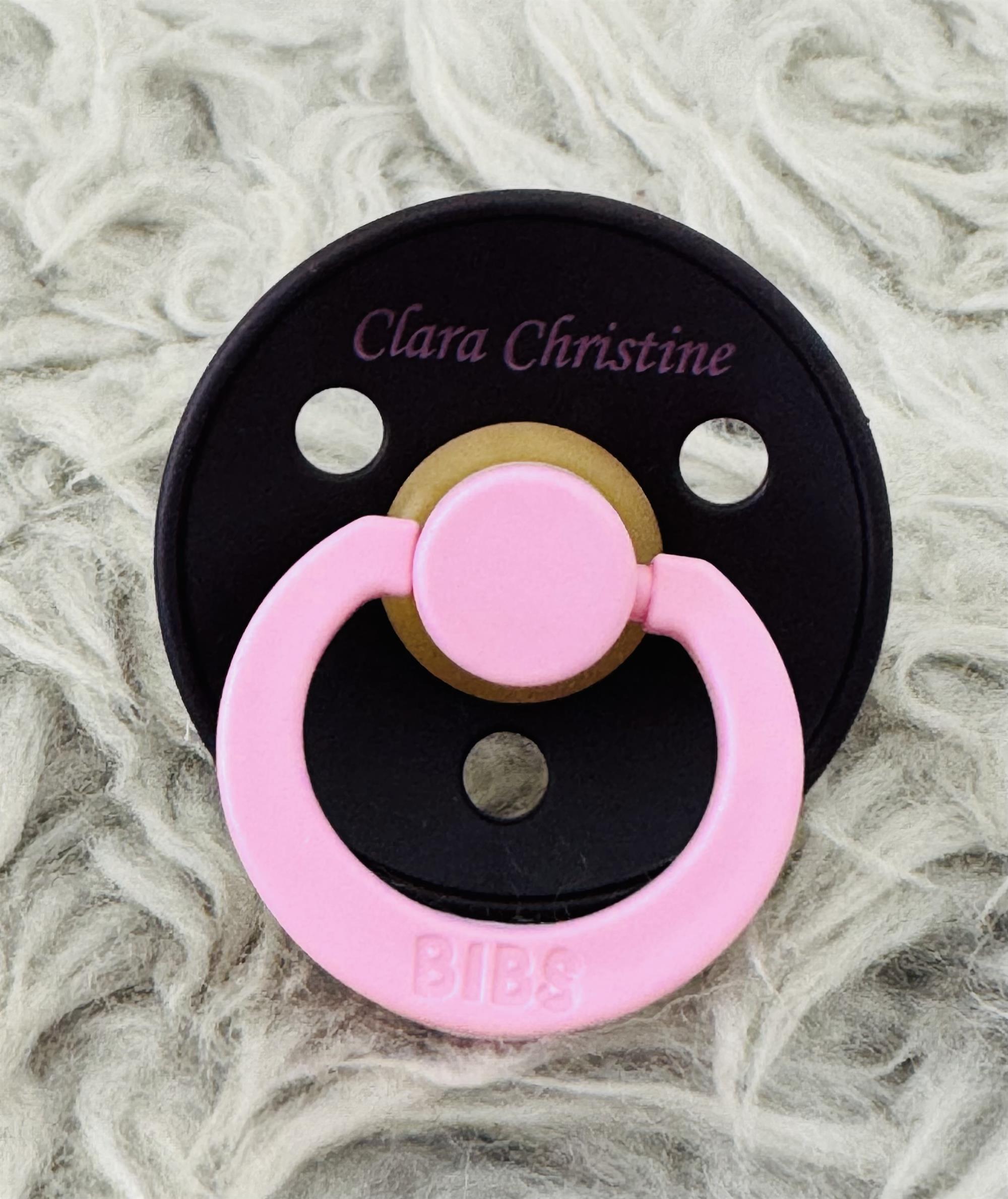 Navnet indgraveres på forsiden ( som ses når barnet har sutten i munden) eller på bagsiden ( som vender ind mod munden)