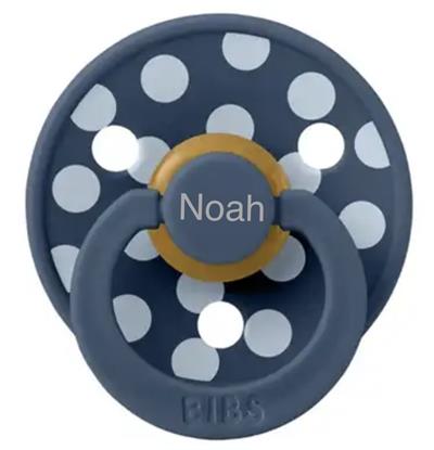 BIBS sut med navn str 2 rund STEEL BLUE polka dots