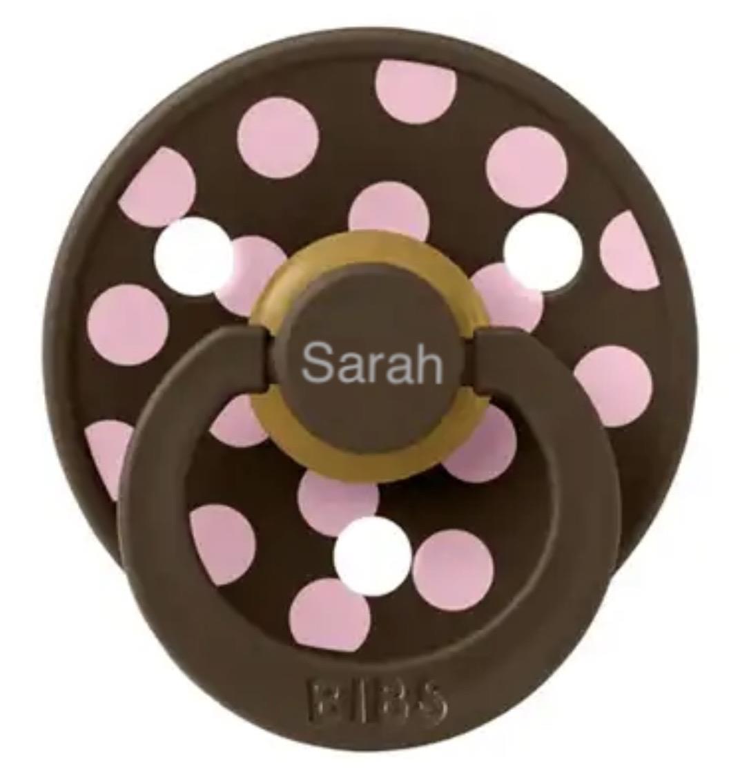 Navnet indgraveres på forsiden ( som ses når barnet har sutten i munden) eller på bagsiden ( som vender ind mod munden)