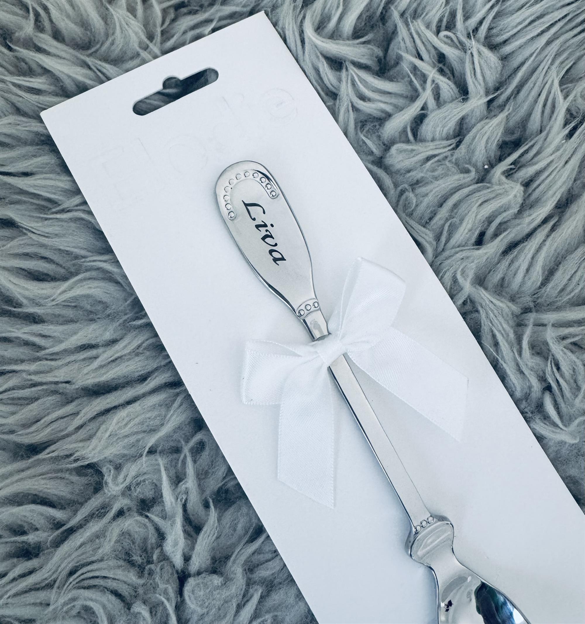 Super sød ske med navn og dato indgraveret øverst på skeens forside.