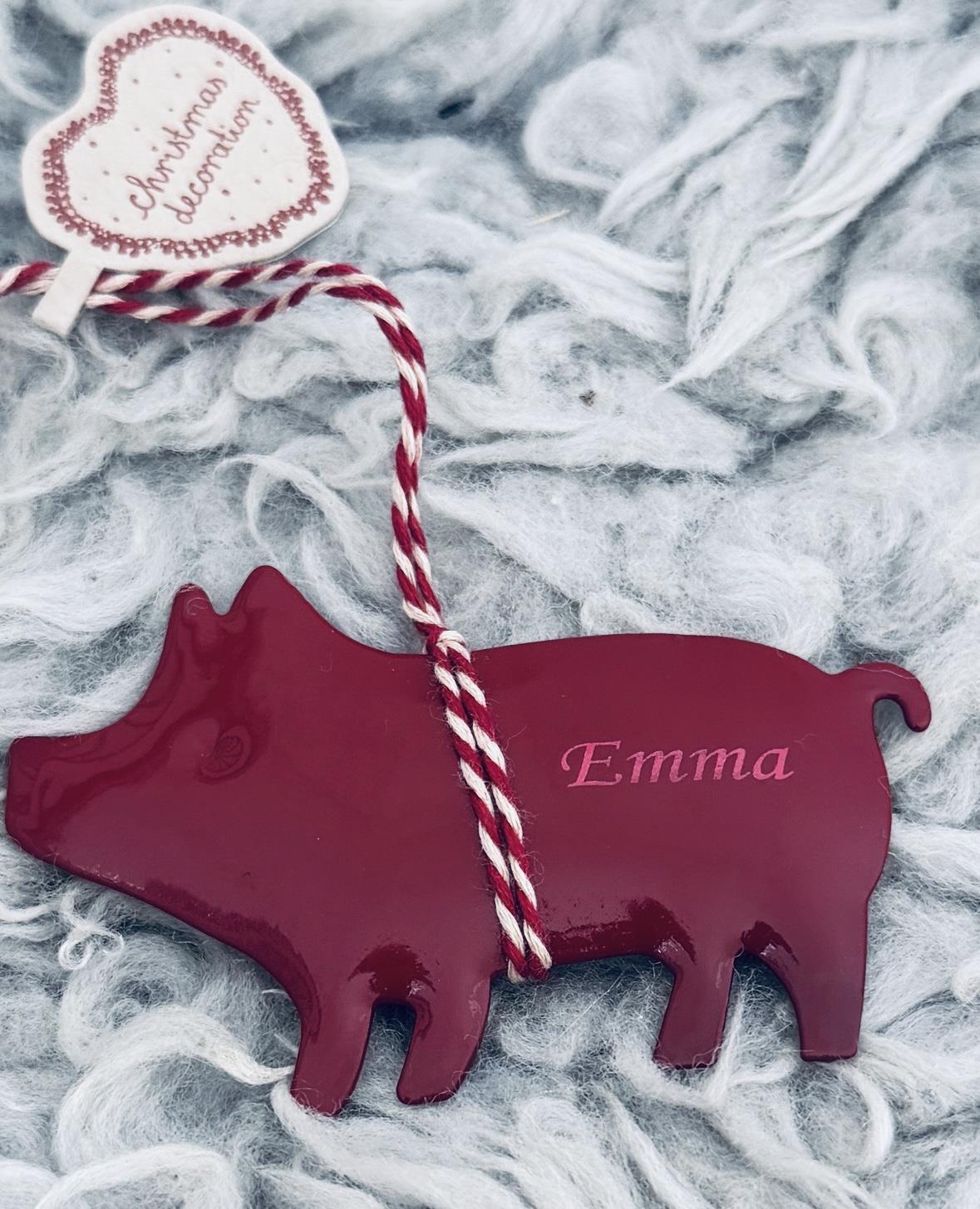 Vi graverer på grisens bagerste del. Navnet bliver lysere rødt fremhævet med kontrast på den røde farve.