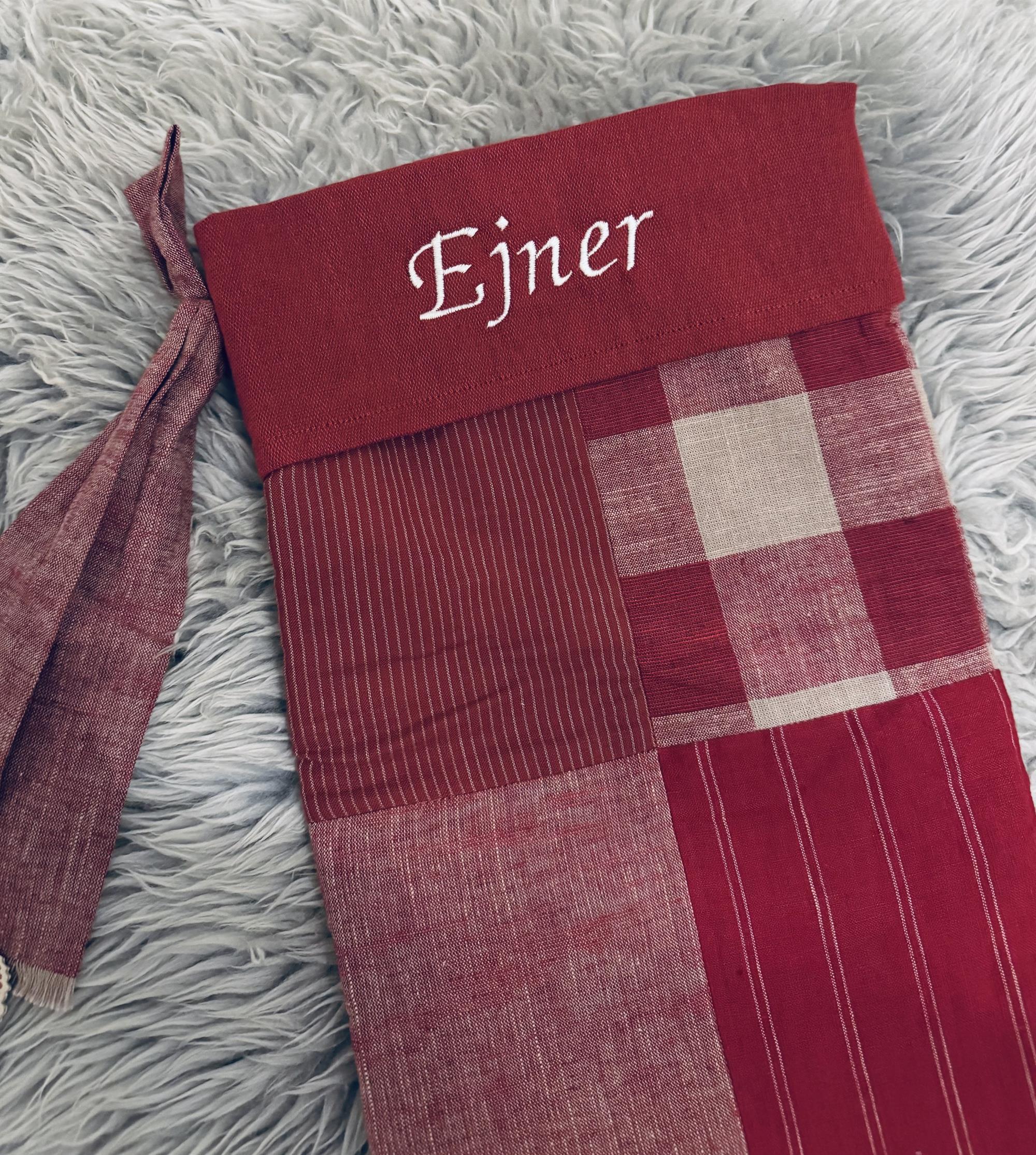 Vi broderer barnets navn på julesokkens øverste røde kant.