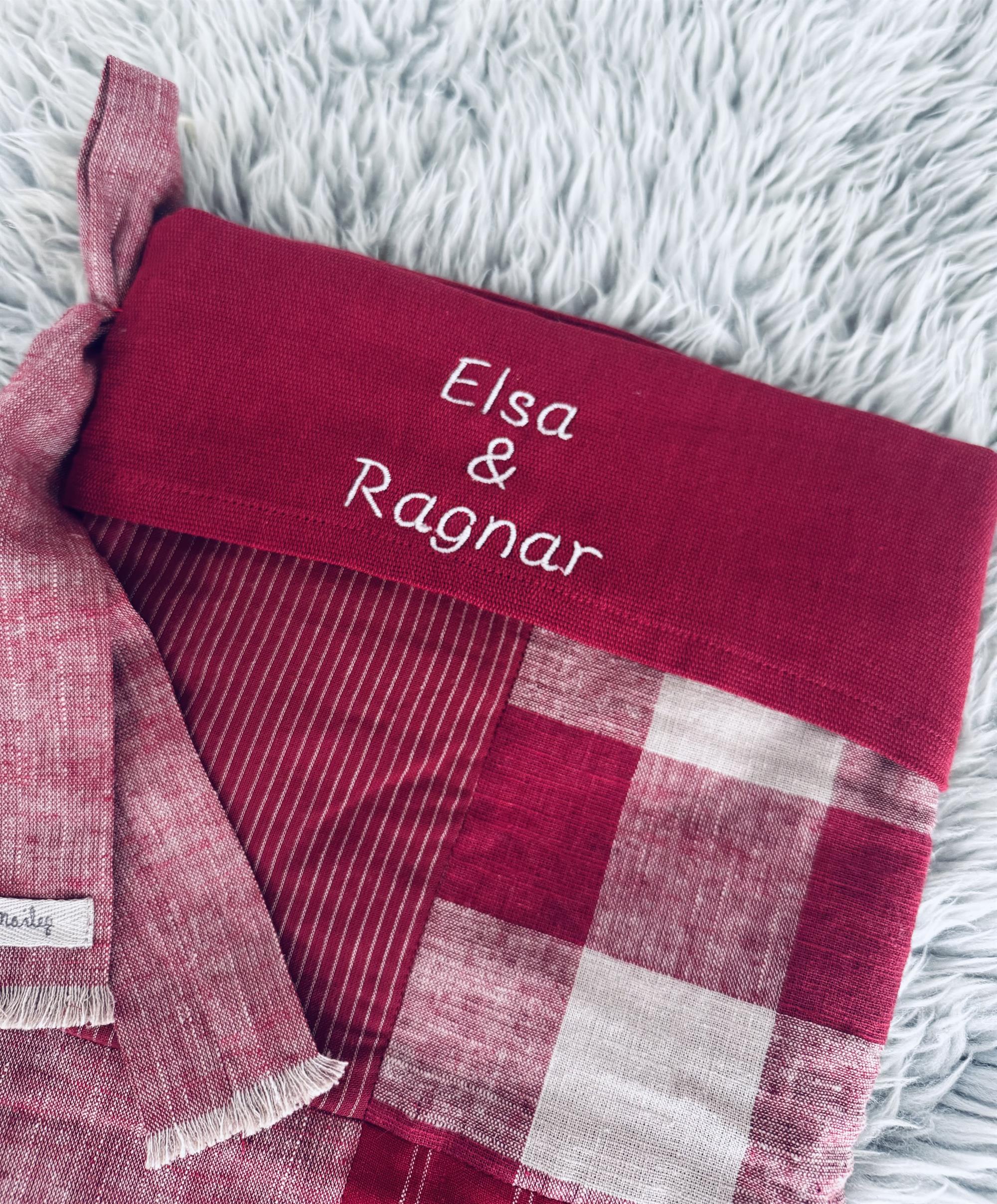 Obs at de mørke broderingstråde ikke giver stor synlighed af navnet.